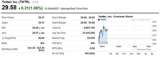 此前Twitter二季度财报令市场失望,导致该公司股价暴跌。周一,Twitter收盘价跌至历史最低点,市场普遍对该公司增长前景感到担忧。周一该公司股价收盘下跌超过5.5%,至29.27美元,并在盘中一度跌破29美元,跌幅超过6%,不过仍高于发行价每股26美元。上周,Twitter股价累计跌幅已达到15%。