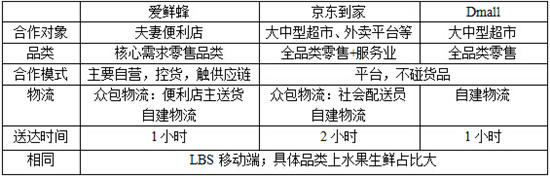从上图可以清晰地看出,虽然都做的是O2O及时上门的快生意,但是每家都有着这样那样的区别,爱鲜蜂的主要特点有两个方面,一是合作对象是处在传统零售业中竞争力较弱的夫妻便利店,二是重点品类商品自营。