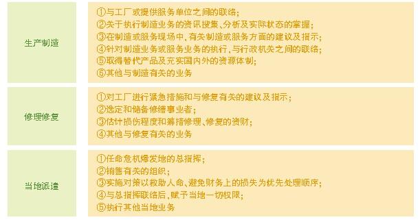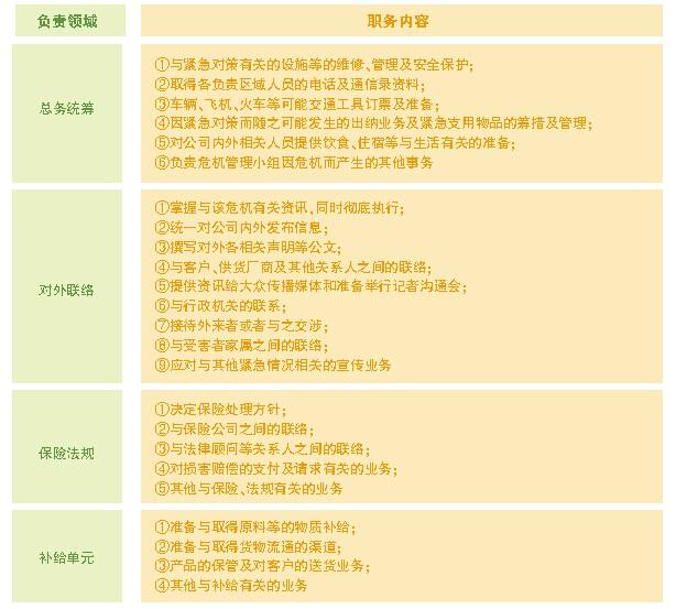 根据日本危机管理权威机构的研究成果,危机管理小组的涵盖面要具有广泛性,应该包括总务、对外联络、宣传、保险、法规、补给、制造、修理、修复、当地派遣等方面。