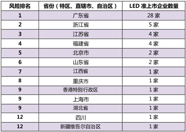 目前,中国LED上市企业超过50家,总部分布于全国13个省份(特区、直辖市、自治区),分布在上游外延芯片、中游封装、下游应用和配套设备、材料、配件这4块产业链当中。根据各省(特区、直辖市、自治区)的LED企业发生形象危机的数量、损失、危害和影响程度,对中国LED准上市企业形象危机风险作出以下排名。