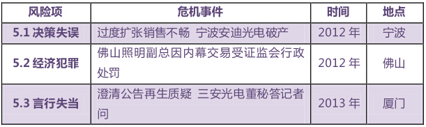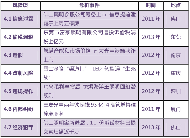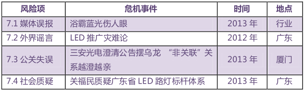 中国LED企业形象危机风险主要包括7大类:产品生产、商流物流、企业经营、企业运营管理、企业领导、企业社会责任、企业公共关系。
